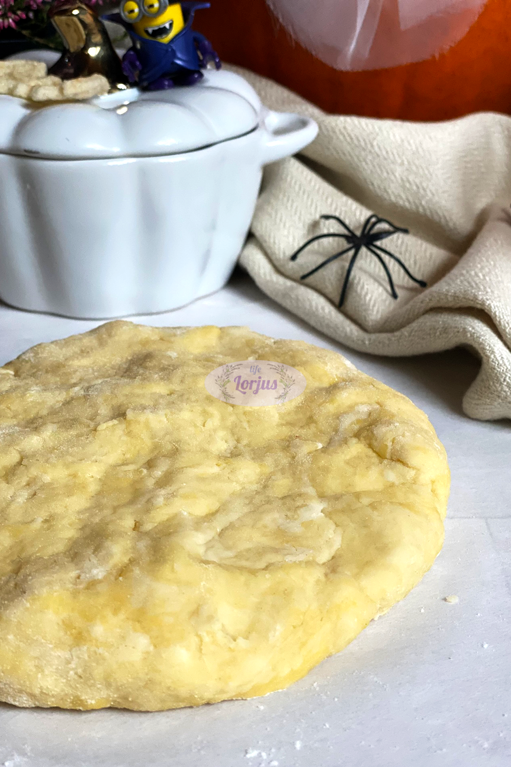 - Beriame tarkuotą fermentinį sūrį, miltus, įpilame pieno ir užminkome tešlą.