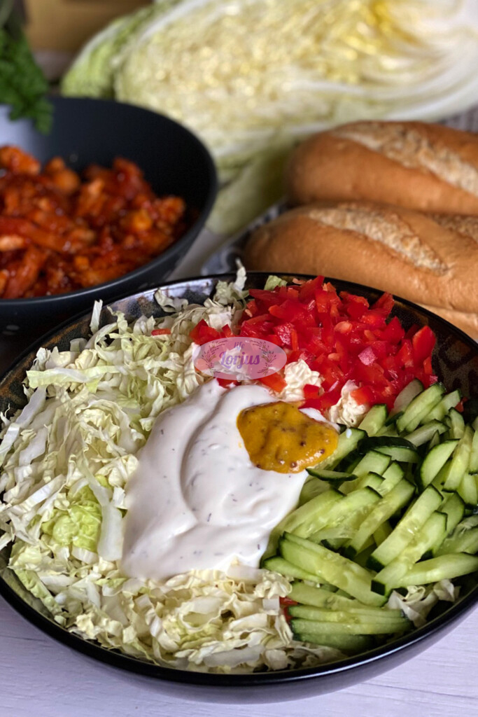 - Į dubenį beriame pjaustytą pekino kopūstą, agurką, papriką.