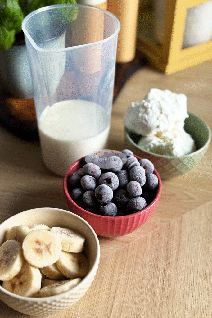 - Į indą su pienu beriame šaldytus bananus, šilauoges.
