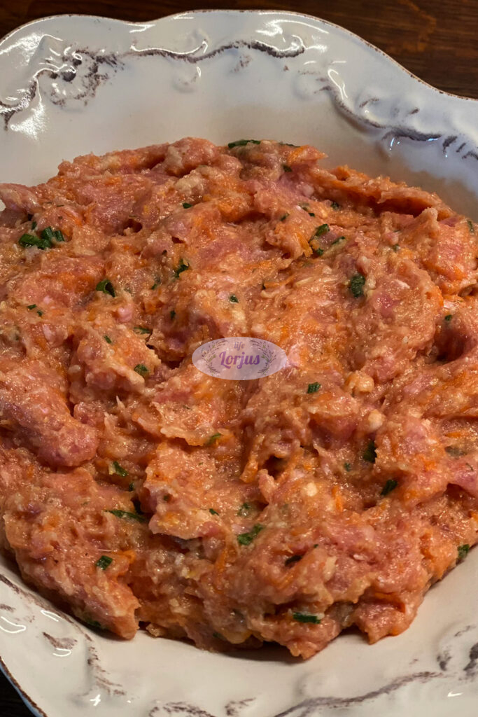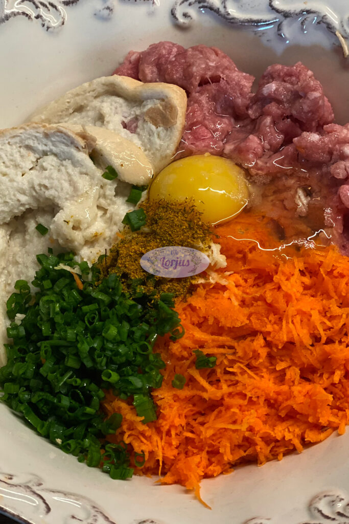 - Į dubenį dedame maltą kiaulienos kumpį, piene mirkytas batono riekeles, smulkia tarkele tarkuotą morką, įmušame kiaušinį, beriame smulkintus svogūnų laiškus, prieskonių mišinį kiaulienai, įtarkuojame česnako skilteles.