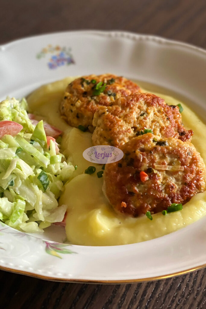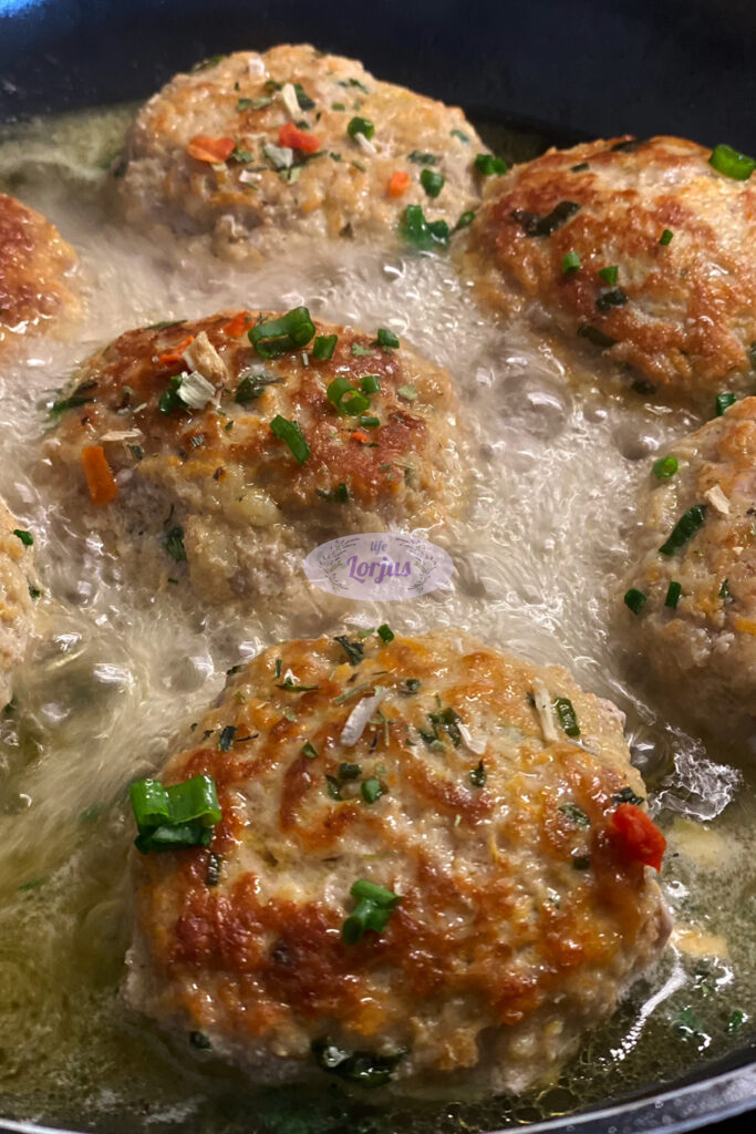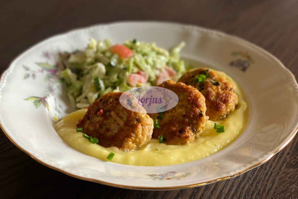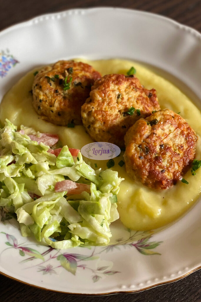- Iš pasiruoštos masės suformuojame nedidelius kotletus, kuriuos po kelias minutes apkepame keptuvėje su trupučiu aliejaus iš abiejų pusių.
