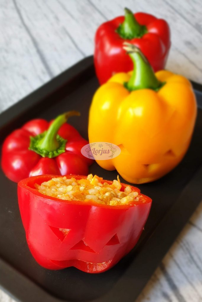 Šiandien vakarienei – orkaitėje keptos paprikos įdarytos malta mėsa ir ryžiais. Visai nebloga idėja artėjančiam helovinui.