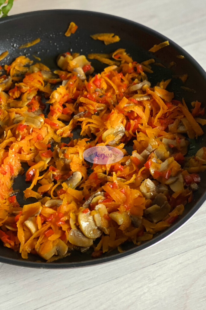 - Kol kukuliai ir bulvės verda, pasikepiname daržoves – keptuvėje išlydome sviestą, beriame tarkuotas morkas, pjaustytus pievagrybius, papriką.