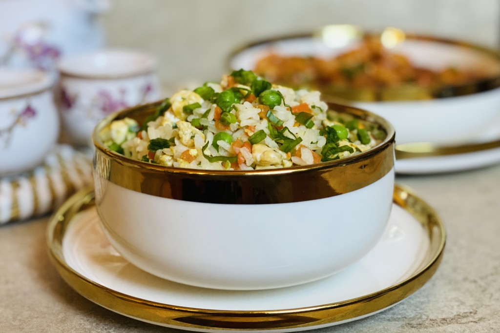 Gardūs ir sotūs ryžiai su kiaušiniu ir kepintomis daržovėmis. Taip paruoštus ryžius galima valgyti ir vienus, bet jie labai tinka prie traškios vištienos padaže.