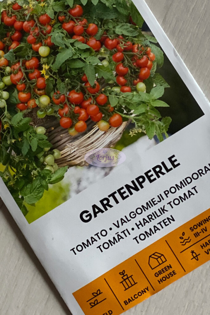 - GARTENPERLE šią veislę gamintojas pristato kaip labai derlingą ir dekoratyvią, kuri auginama vazonuose, loveliuose, ar pakabinamuose krepšiuose, dėl žemyn svyrančių šakų, nusėtų mažais, vyšnios dydžio, saldžiais pomidoriukais. Nereikia genėti ar rišti. Šiuos taip pat planuoju auginti pakabinamuose krepšiuose.