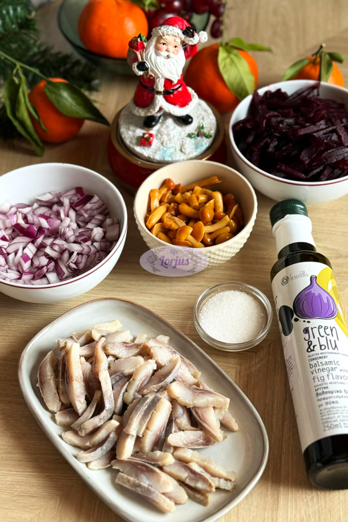 • Burokėlius supjaustome šiaudeliais, svogūną – stambesniais kubeliais, silkės filė – juostelėmis, stambesnius kelmučius taip pat supjaustome.