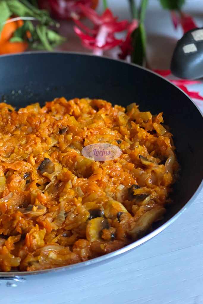 - Dedame griežinėliais pjaustytus pievagrybius, burokine tarkele tarkuotus obuolius, ir kepiname kol daržovės ir obuoliai suminkštės.