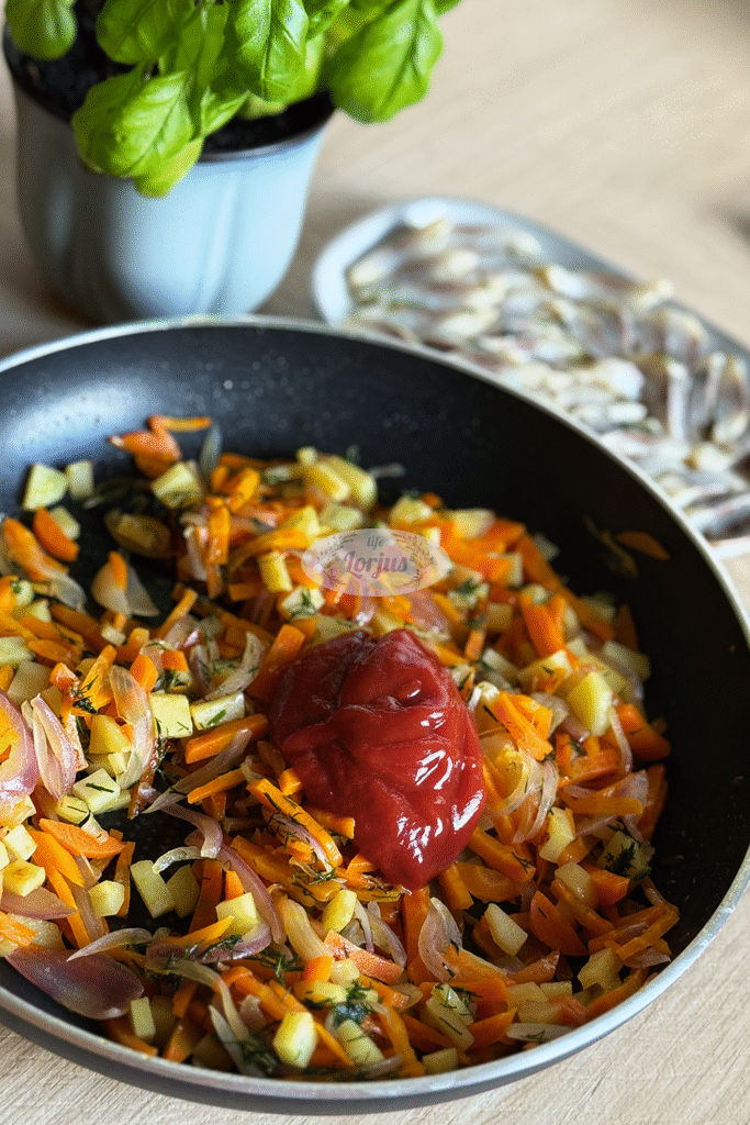 - Įdedame pomidorų padažo, išmaišome ir dar trumpai pakepiname.