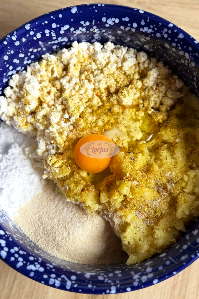 - Į dubenį dedame smulkia tarkele tarkuotas bulves, varškę, beriame manų kruopas, bulvių krakmolą.