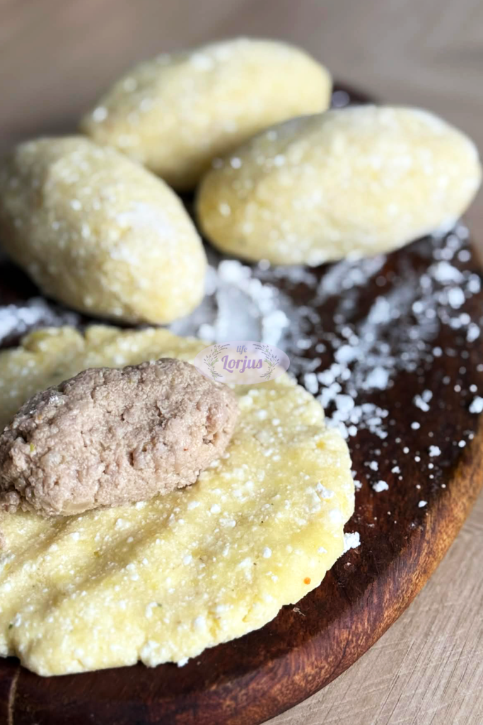 - Imame šiek tiek pasiruoštos masės, suformuojame paplotėlį, dedame pasiruošto kiaulienos įdaro, užspaudžiame suformuodami norimos formos cepeliną.