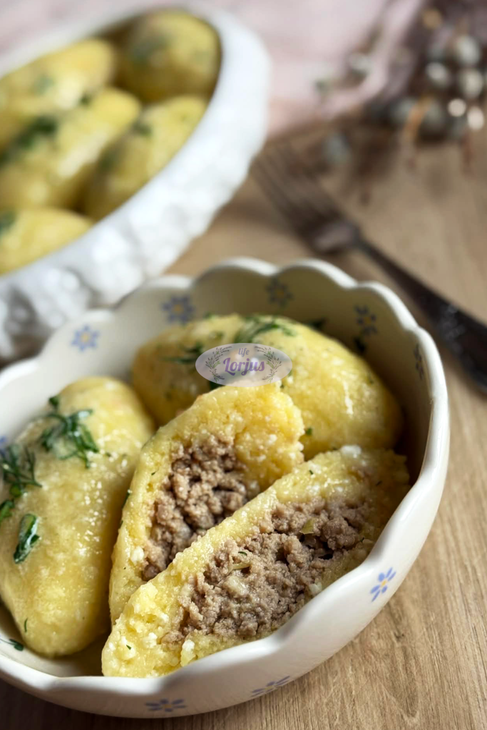 - Šilkiniai virtų bulvių ir varškės cepelinai su kiauliena paruošti, tiekiame su mėgiamu padažu ar tiesiog grietine – skanaus!