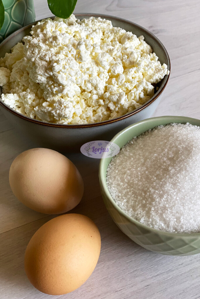 - Į dubenį dedame varškę, beriame paprastą ir vanilinį cukrų, žiupsnelį druskos, įmušame kiaušinius ir gerai ištriname šaukštu.