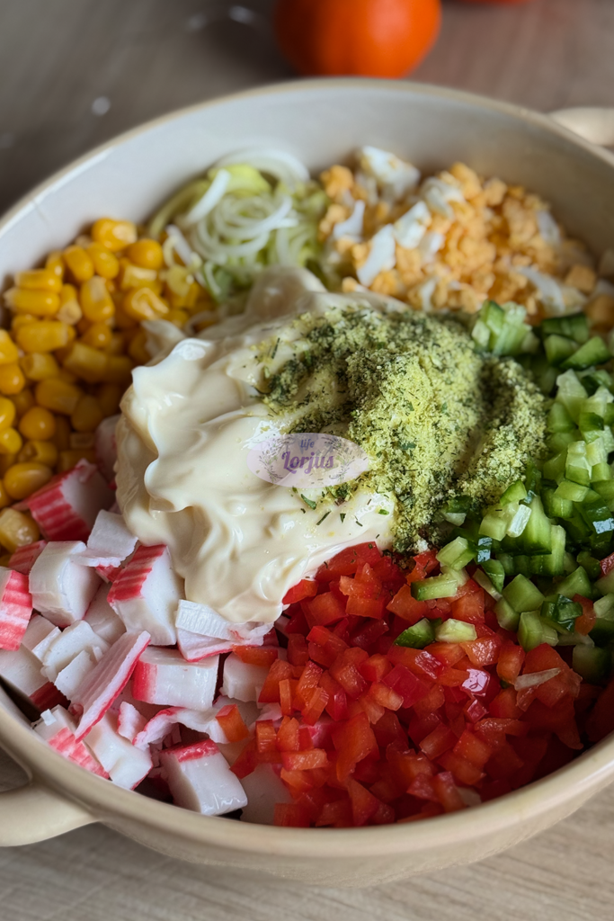 - Į dubenį beriame pjaustytus kietai virtus kiaušinius, agurką, papriką, krabų skonio lazdeles, porą, konservuotus kukurūzus.