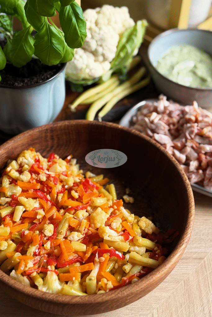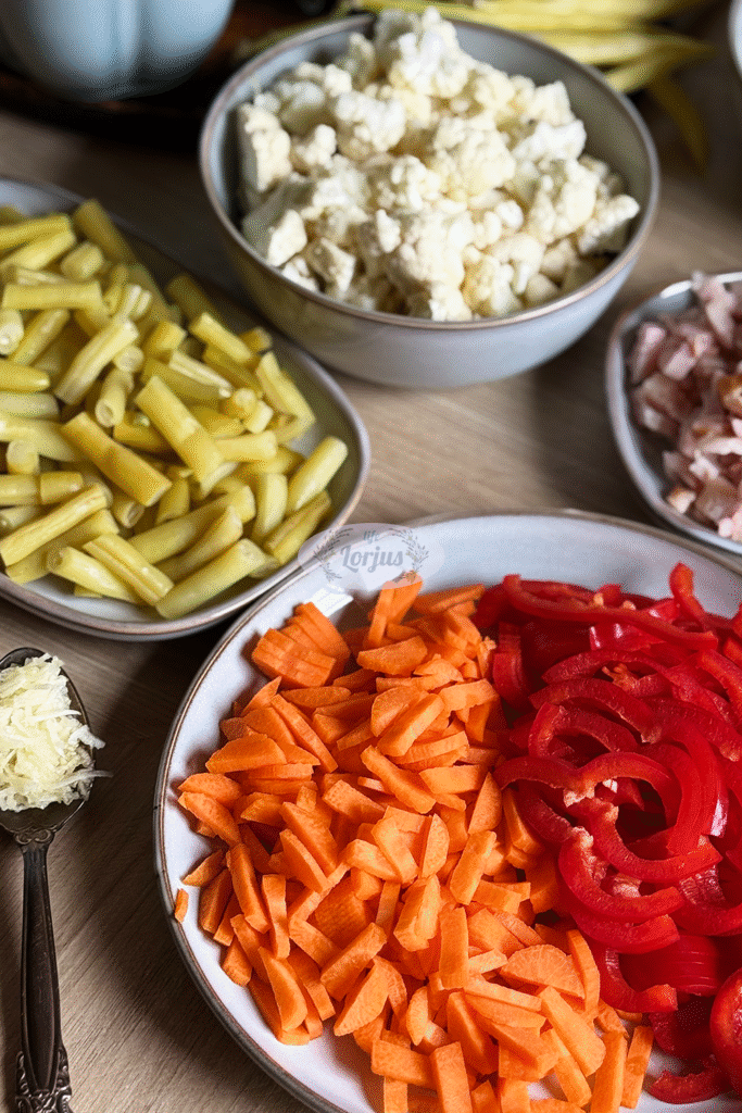 - Keptuvėje įkaitiname šiek tiek aliejaus, beriame apvirtas pjaustytas šparagines pupeles, žiedynais išskaidytą žiedinį kopūstą, pjaustytas morkas, papriką.