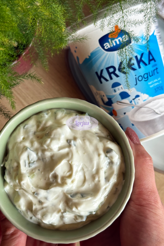 - Dubenėlyje su graikišku jogurtu sumaišome labai smulkiai pjaustytą agurką, tarkuotą česnako skiltelę, džiovintus laiškinius česnakus, citrinos sultis.