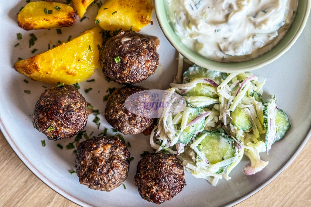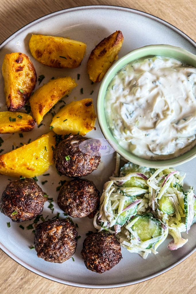 - Sultingi jautienos kukuliai su alyvuogėmis ir kietuoju sūriu paruošti, tiekiame su pasiruoštu gaiviu agurkiniu graikiško jogurto padažu, bulvytėmis ir nepamirštame salotų.