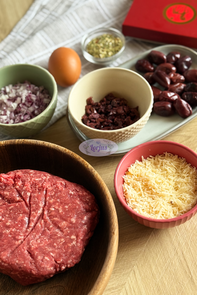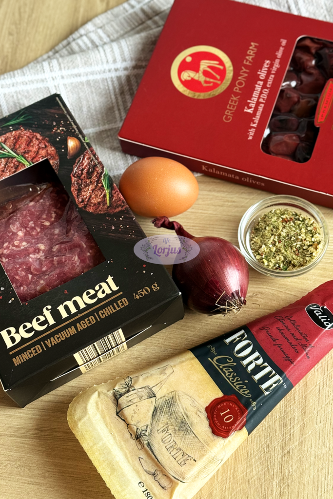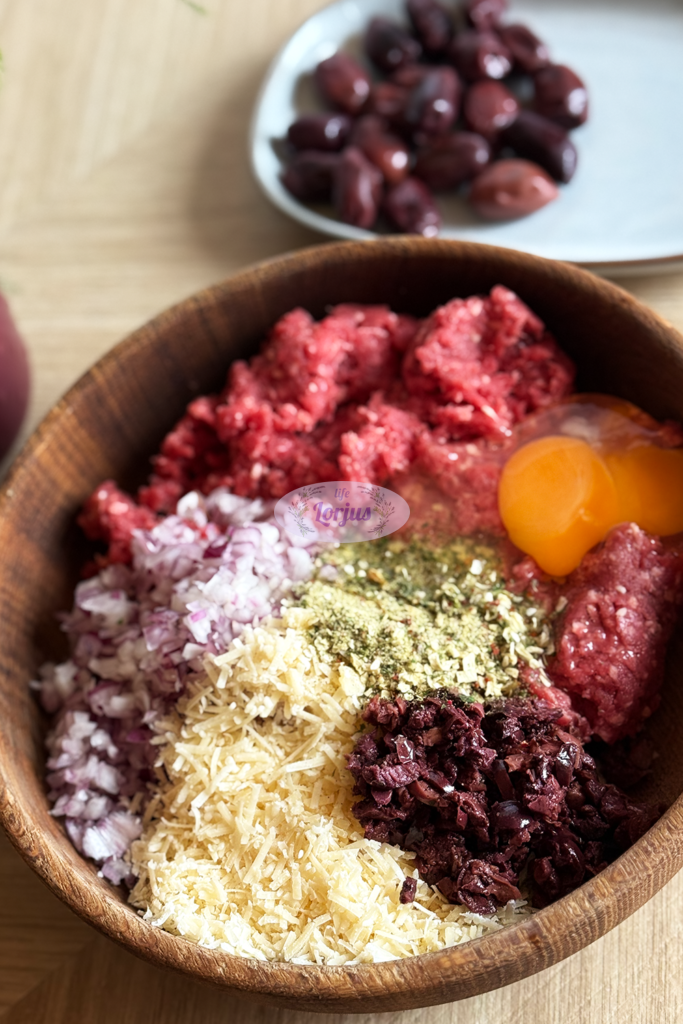 - Į dubenį dedame smulkintą brandintą jautieną, smulkiai pjaustytas Kalamata alyvuoges ir raudonąjį svogūną, beriame kietąjį sūrį, prieskonių mišinio maltai mėsai, įmušame kiaušinį.