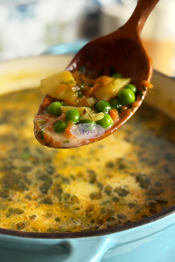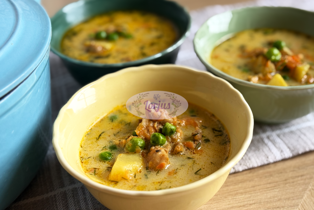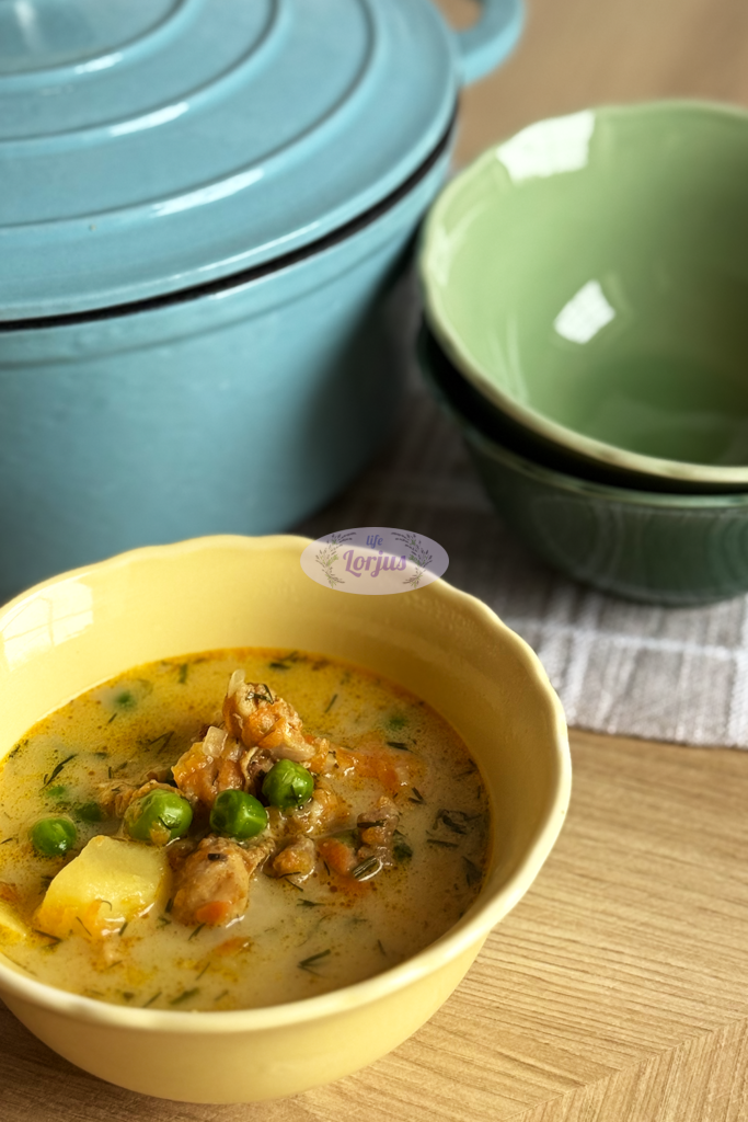 Soti, tiršta ir labai gardi švelnaus skonio vištienos ir žirnelių sriuba su grietinėle.