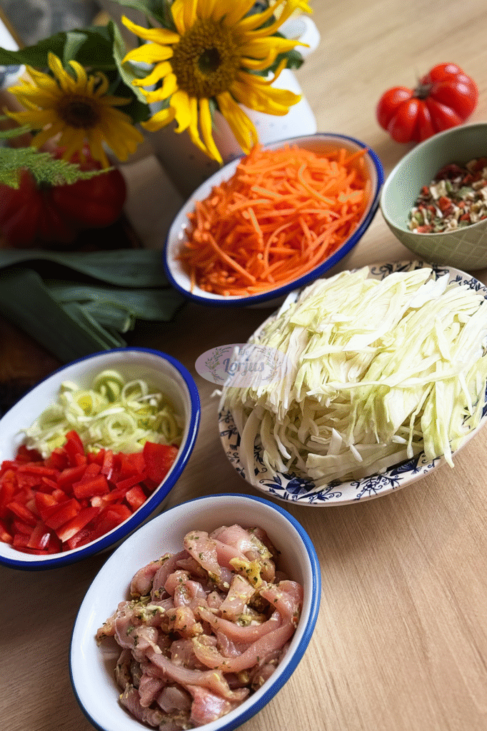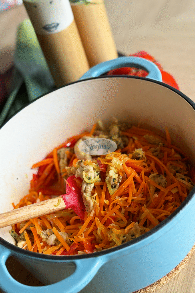 - Dedame pjaustytas morkas, papriką ir porą. Jei reikia – pabarstome druska, išmaišome ir kepiname kol daržovės suminkštės.