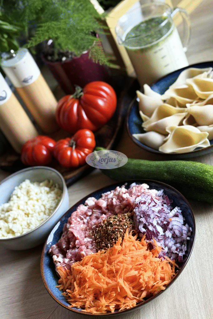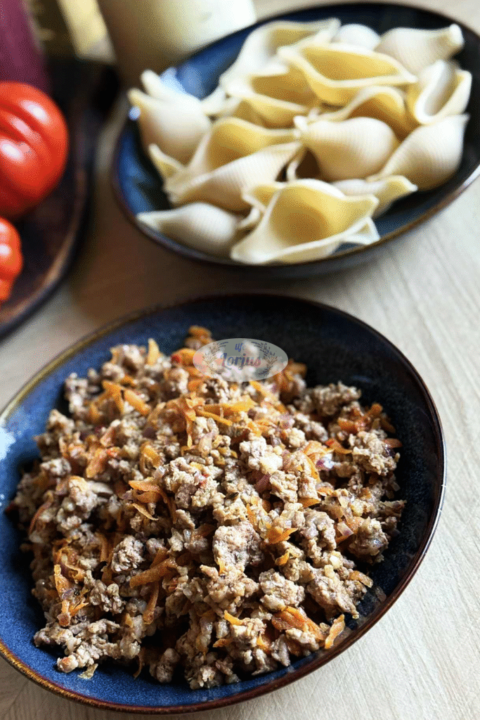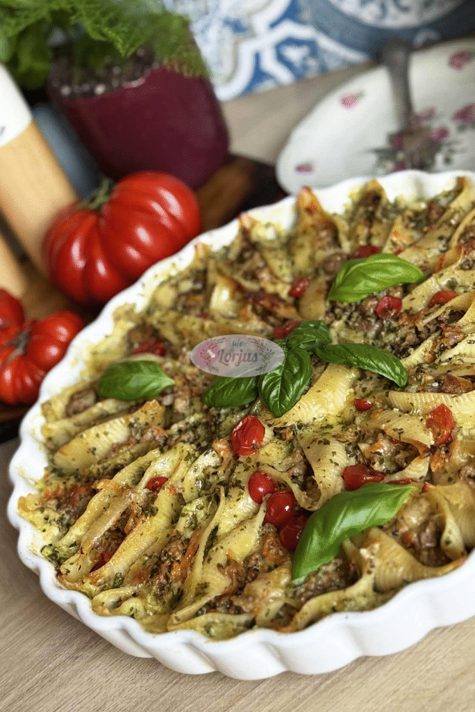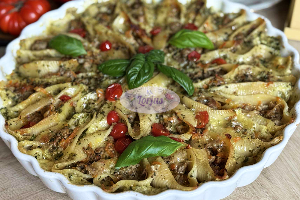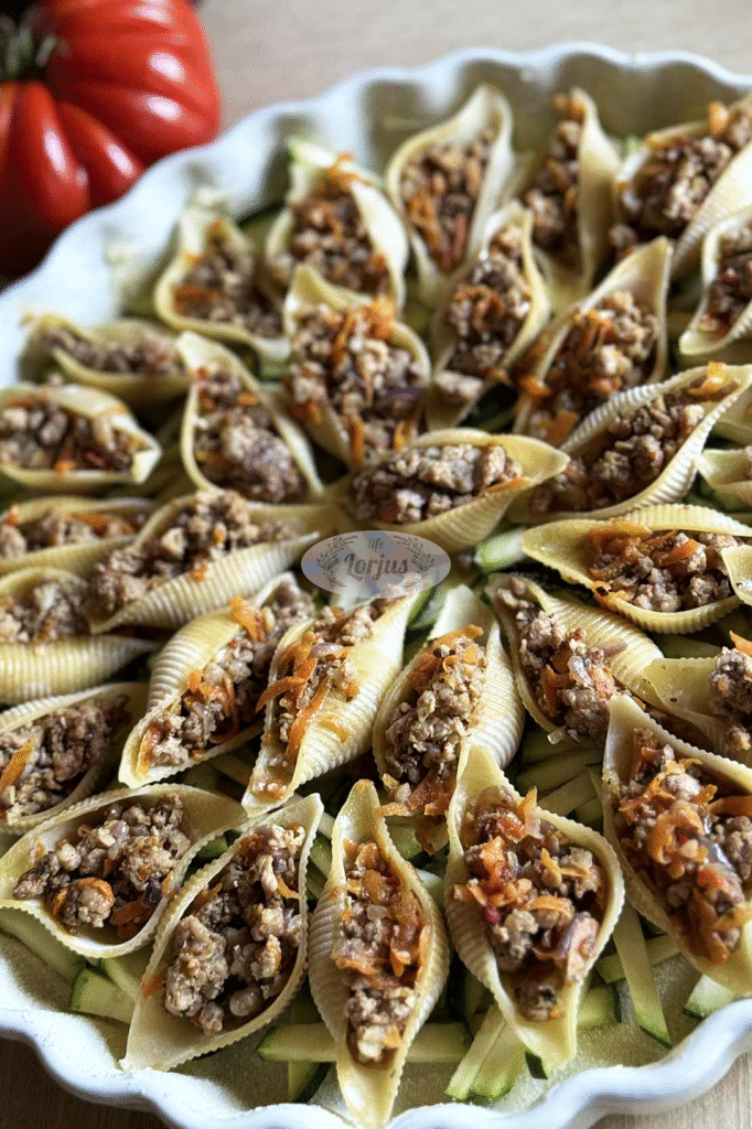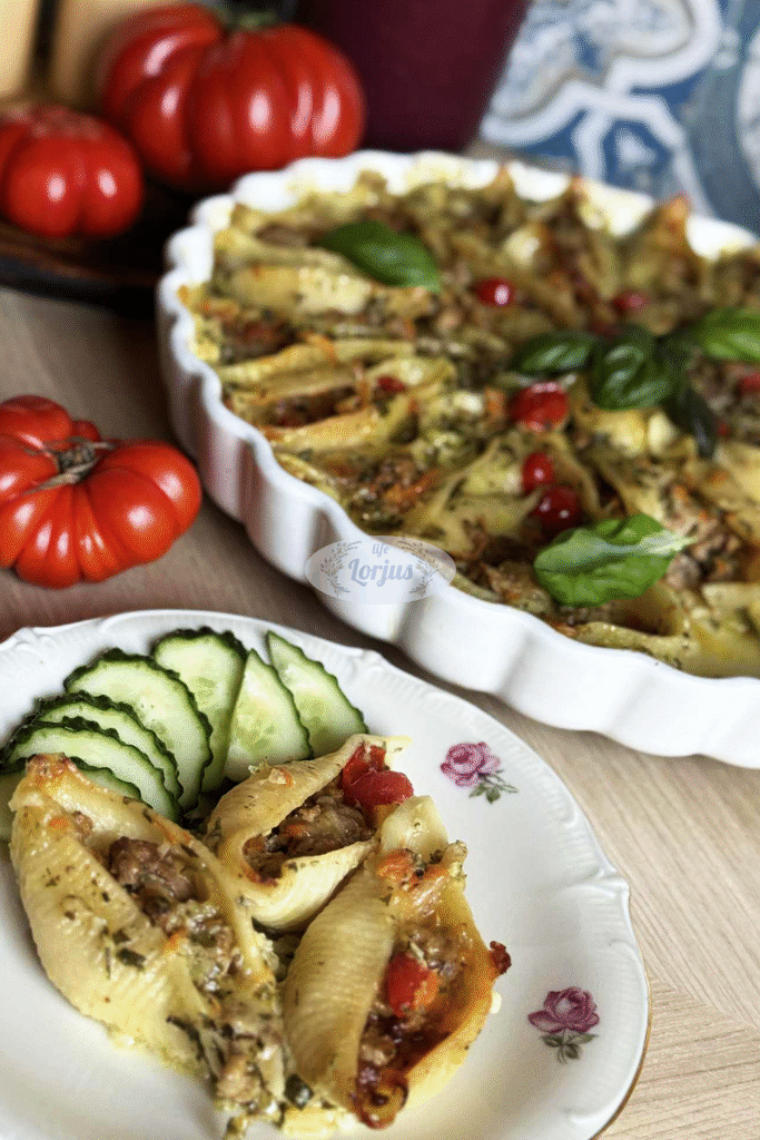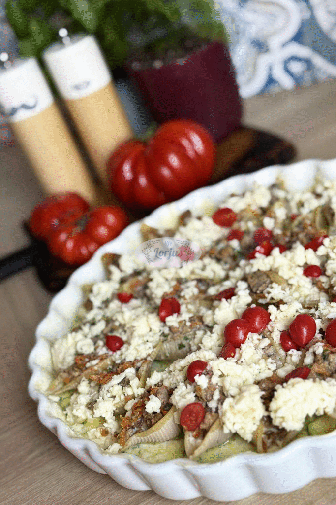 - Tobulas makaronų kriauklelių įdarytų malta mėsa apkepas su cukinija ir sūriu paruoštas, skanaus!
