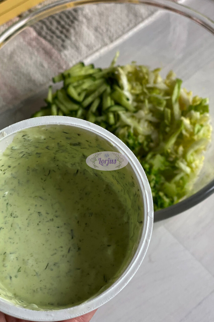 - Į dubenį beriame pjaustytą agurką, kopūstą.