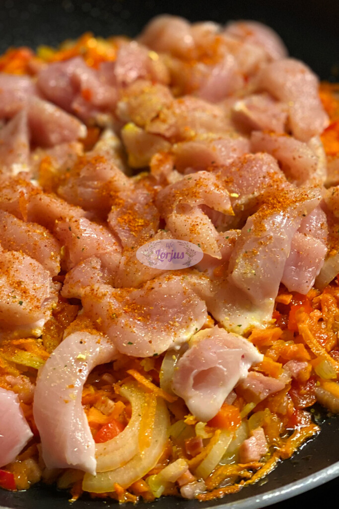 • Dedame pjaustytą vištos krūtinėlę, pabarstome mėgiamais prieskoniais, išmaišome ir kepiname kol vištiena iškeps.