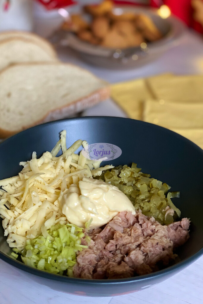 - Į dubenį beriame smulkiai pjaustytus marinuotus agurkėlius, porą, tarkuotą puskietį sūrį, konservuotą tuną.