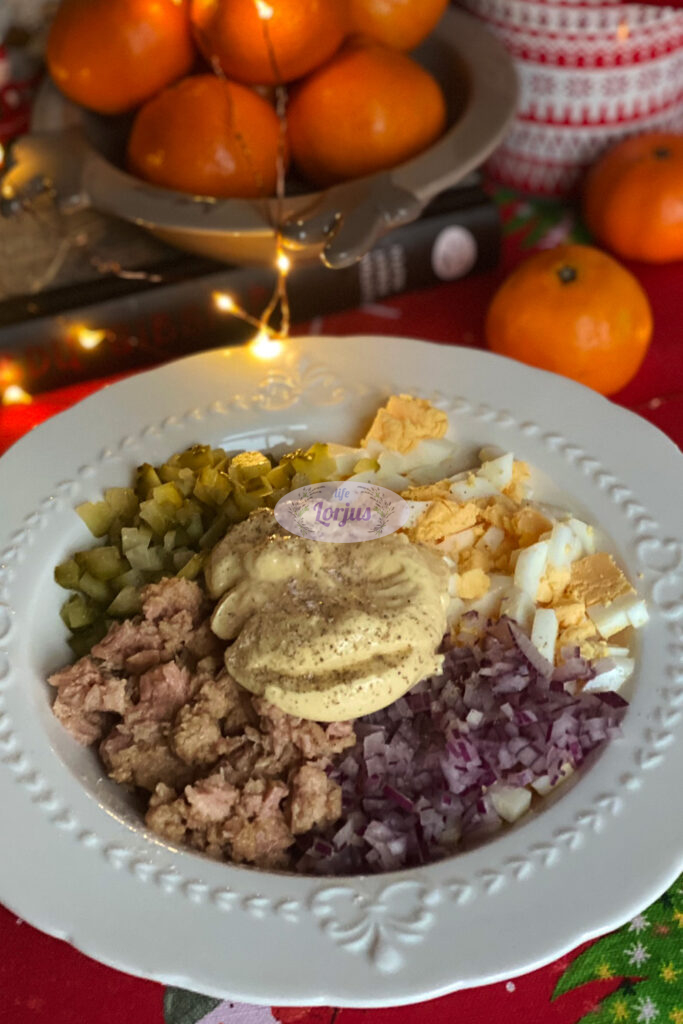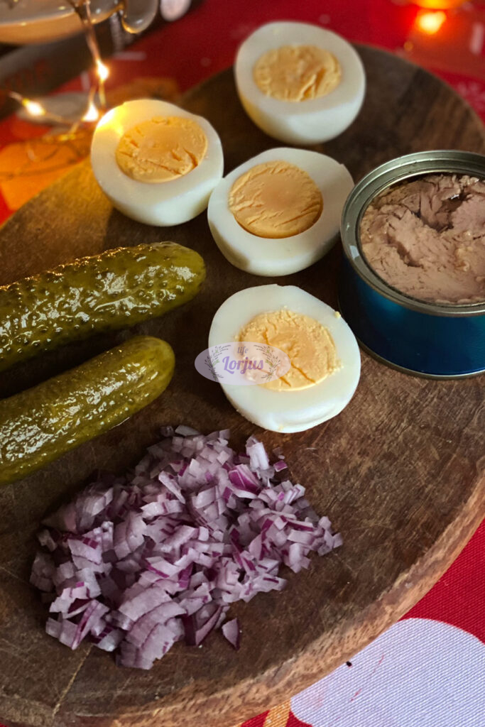 - Į dubenį beriame pjaustytus kietai virtus kiaušinius, kapotą raudonąjį svogūną, marinuotus agurkėlius, konservuotą tuną.