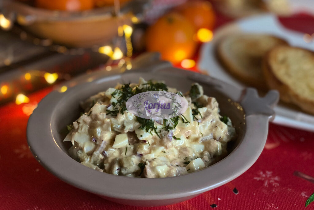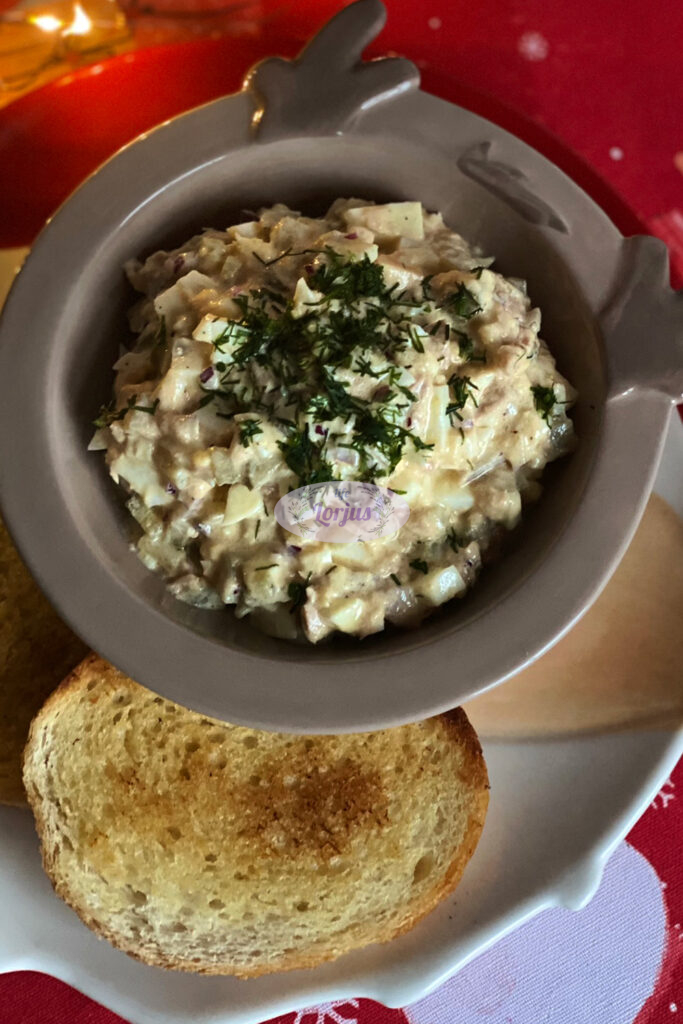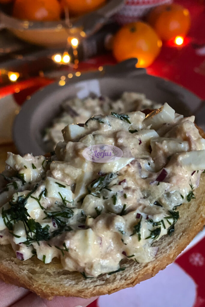 Labai gardi ir soti tuno užtepėlė su kietai virtais kiaušiniais ir marinuotais agurkėliais.