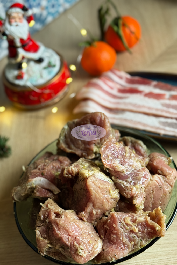 - Išmarinuotus kiaulienos išpjovos gabalėlius apvyniojame kiaulienos šoninės juostelėmis.