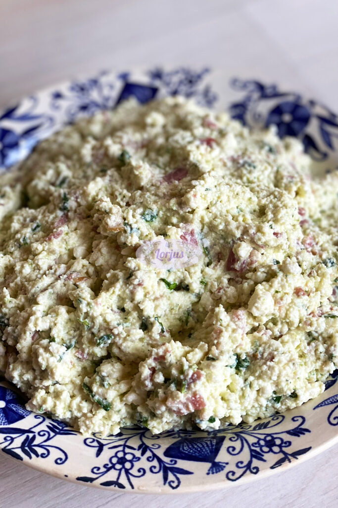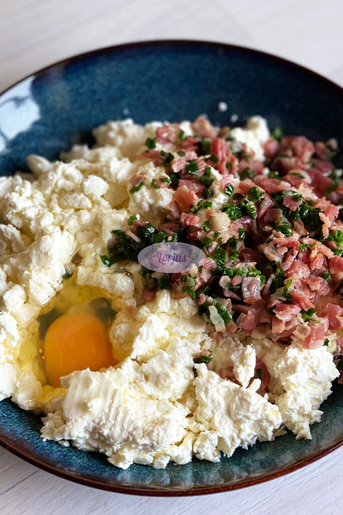 - Į dubenį dedu varškę, su svogūnų laiškais pakepintą kiaulienos šoninę, įmušu kiaušinį.