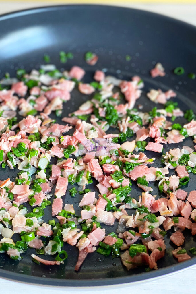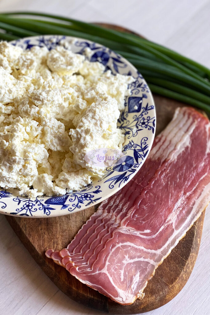 - Pirmiausia pasiruošiu varškės įdarą – kiaulienos šoninę ir svogūnų laiškus supjaustau, pakepinu sausoje įkaitintoje keptuvėje.