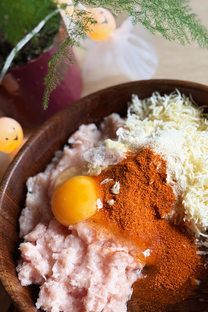 - Įmušame kiaušinį, įtarkuojame česnako skilteles, pabarstome mėgiamais prieskoniais.