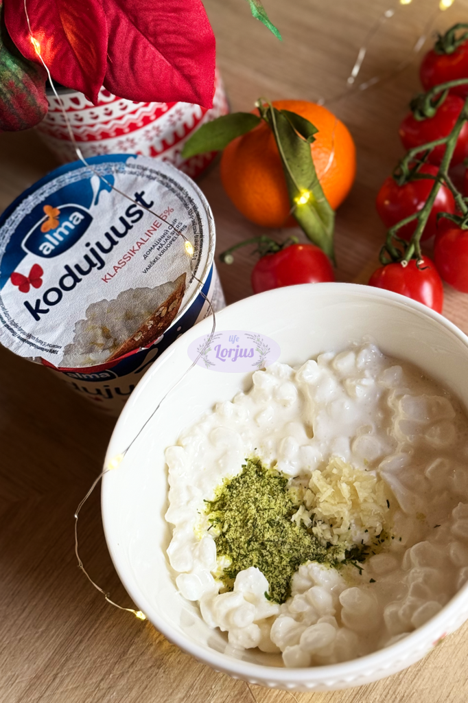 - Dubenėlyje sumaišome varškę kruopelėmis, prieskonių mišinį salotoms, tarkuotą česnako skiltelę.