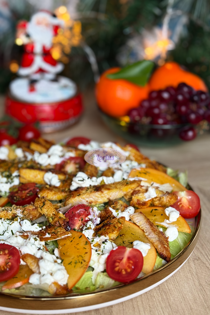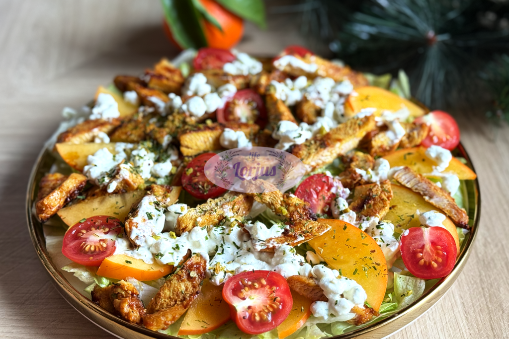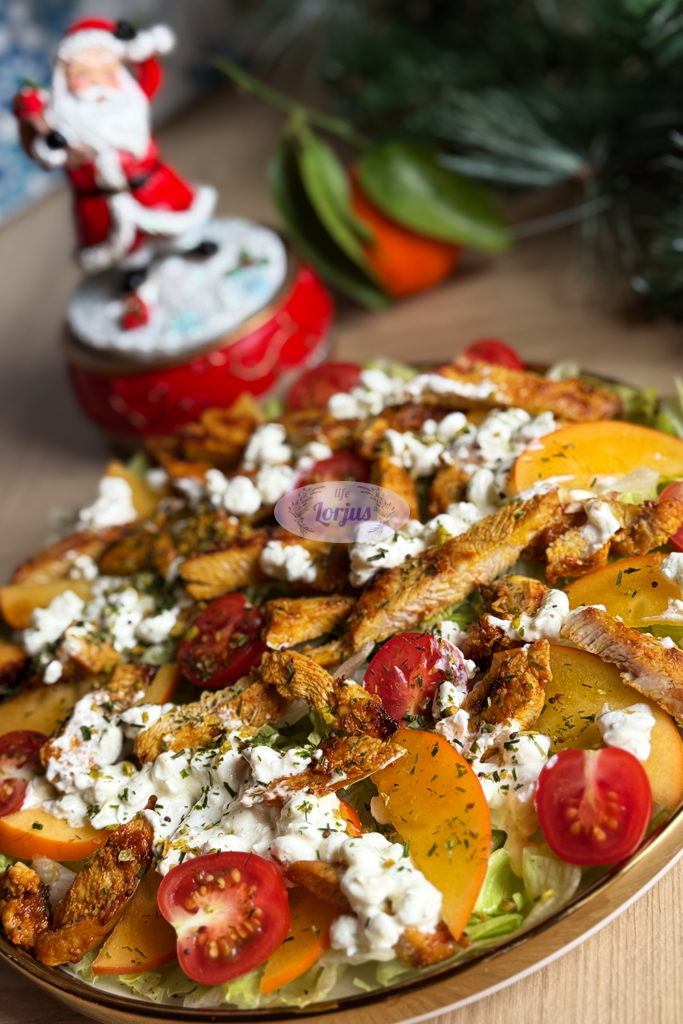 Gaivios vištienos salotos su pikantiška varške kruopelėmis ir persimonais.