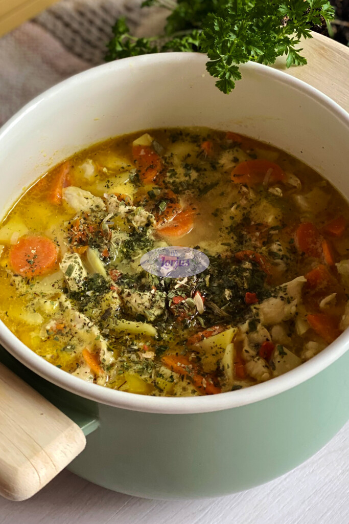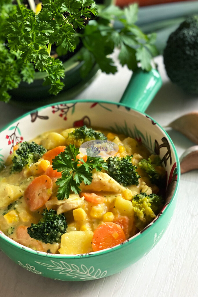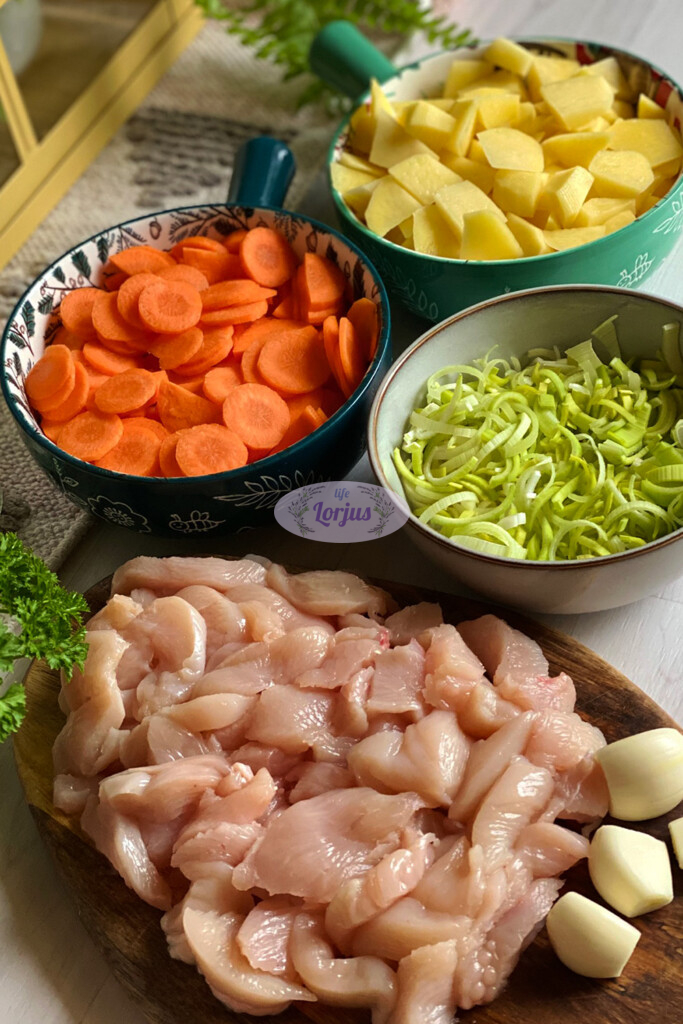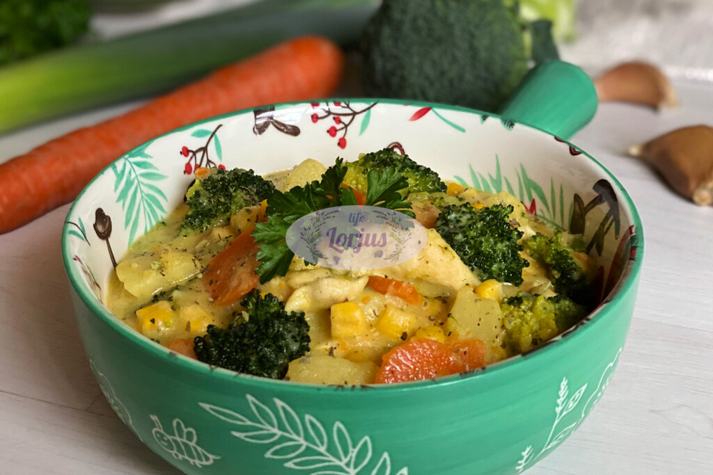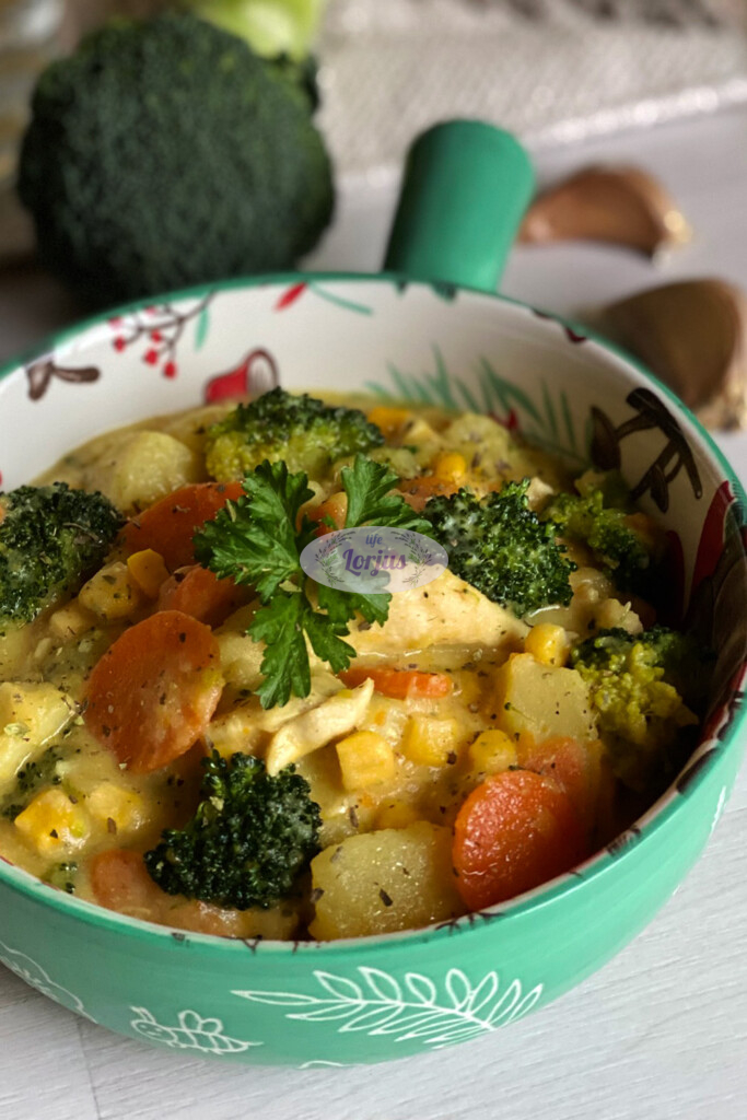 Šiandien norėjosi ko nors jaukaus ir sotaus, tad buvo troškinio diena. Į troškinį nukeliavo mėgiamos daržovės ir vištiena. O užbaigimui pagardinau lydytu sūreliu. Jei lydyto sūrelio nemėgstate – galite keisti grietinėle ar grietine.