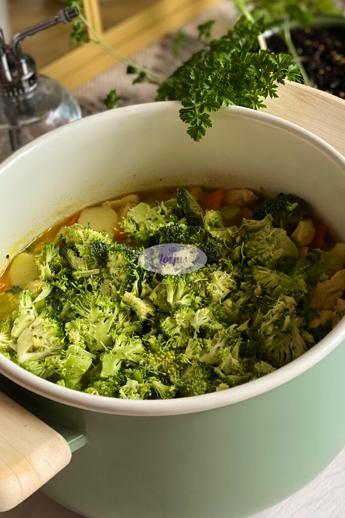 - Beriame pjaustytą brokolį, išmaišome ir puodą uždengę dangčiu troškiname apie 5-8 minutes.