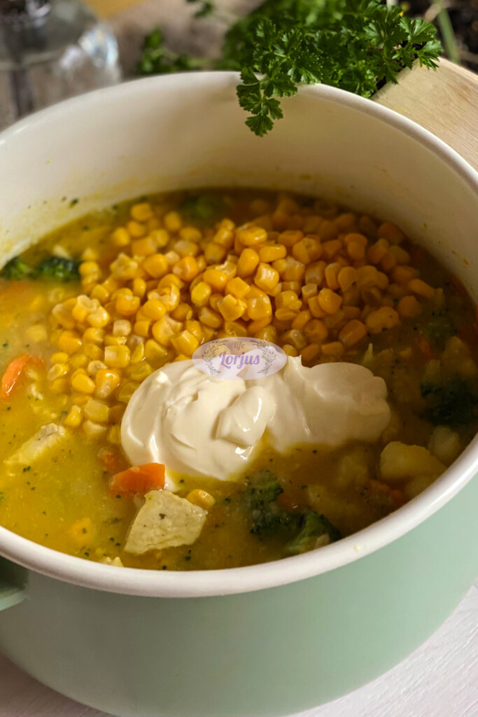- Brokoliui suminkštėjus, beriame konservuotus kukurūzus, įdedame lydyto sūrelio.